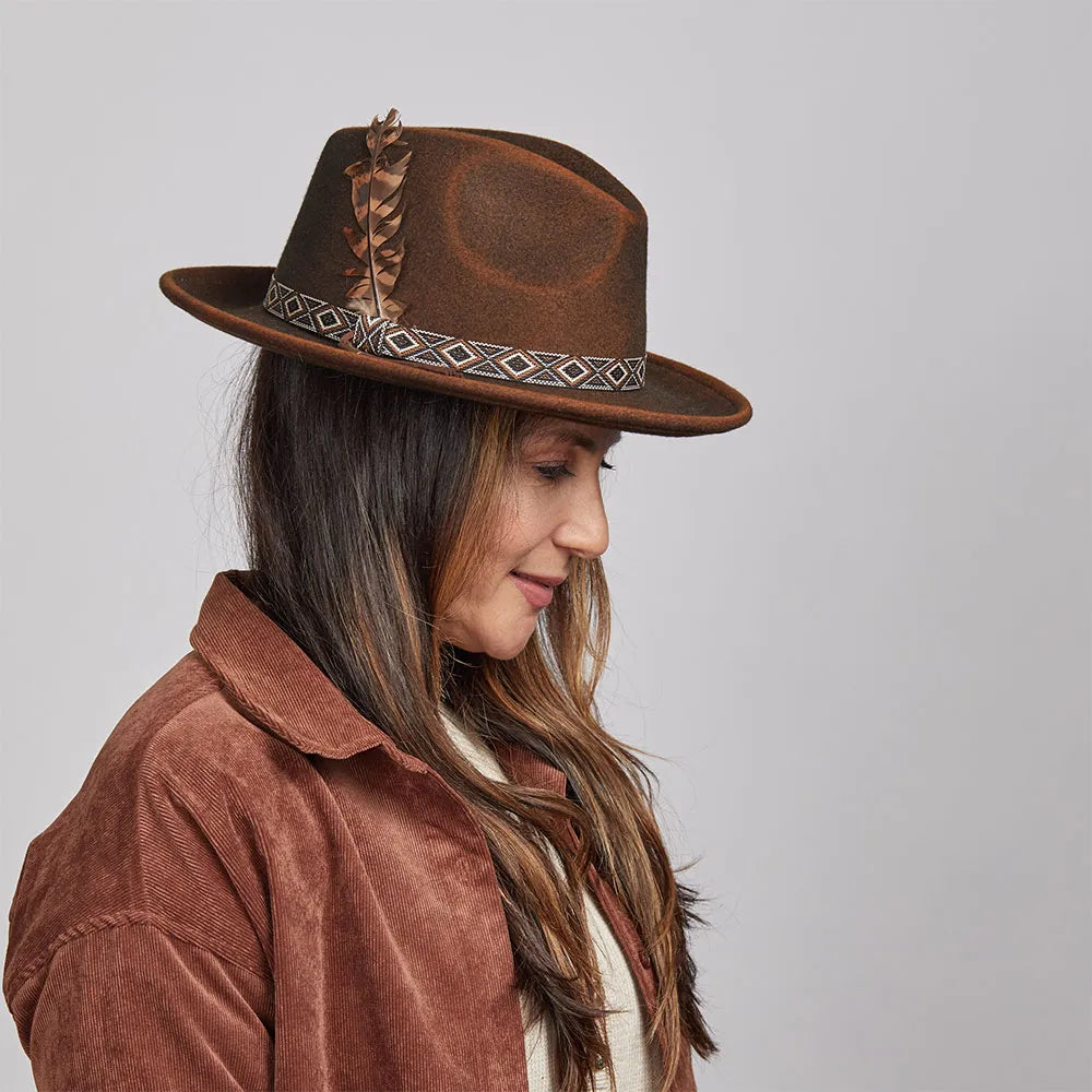 Backroad | Womens Felt Fedora Hat combines boho charm with practical style. Its crushable wool felt and southwest design band with feather and tassel make it perfect for adventurous days.