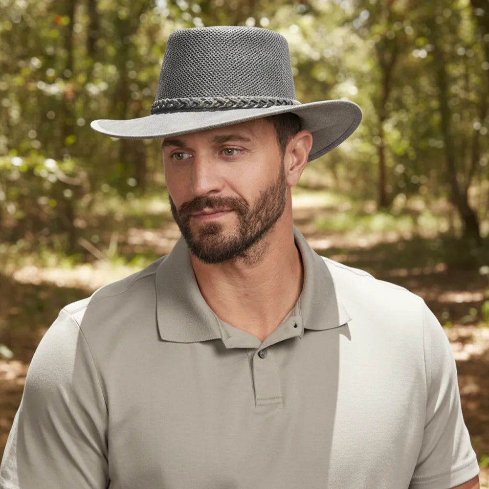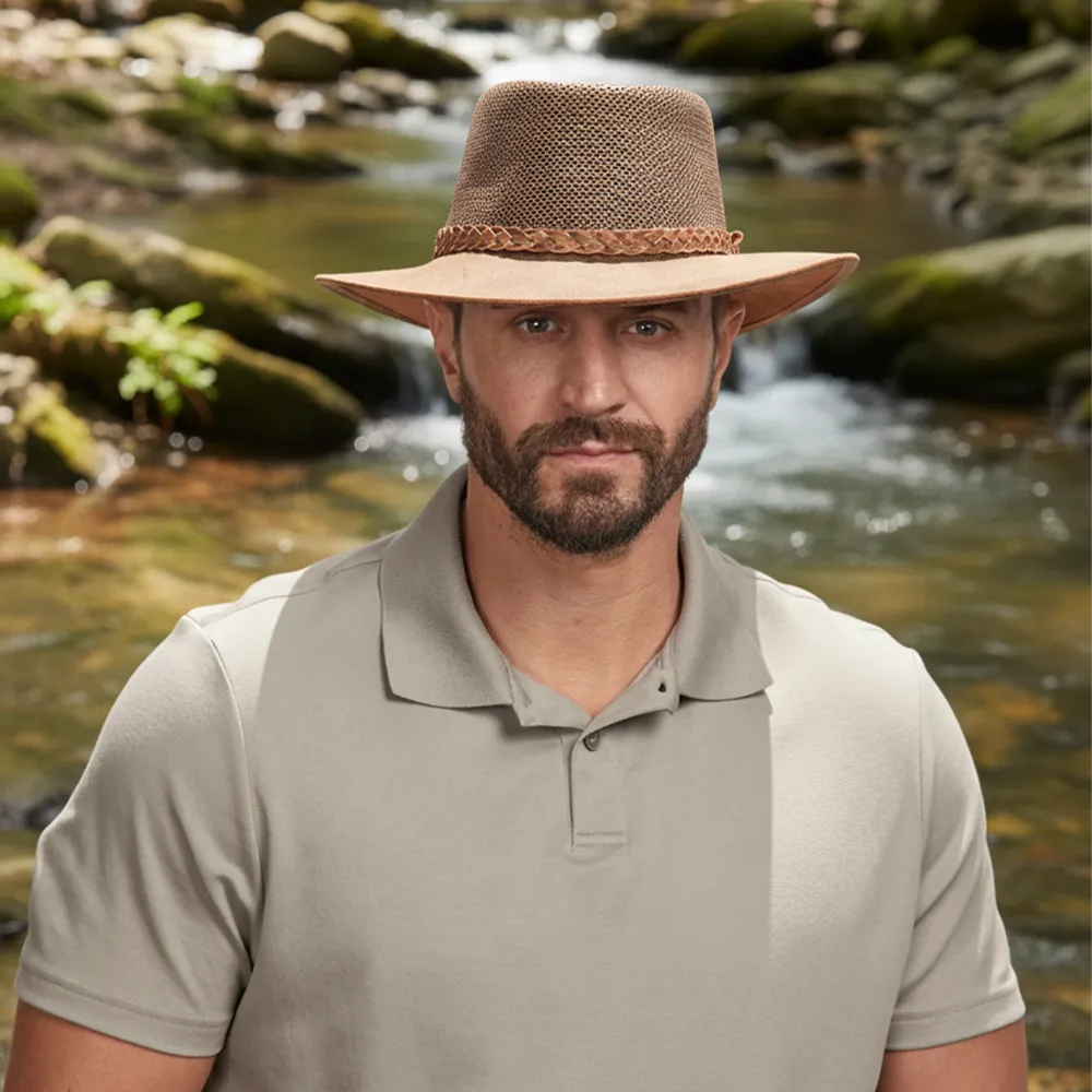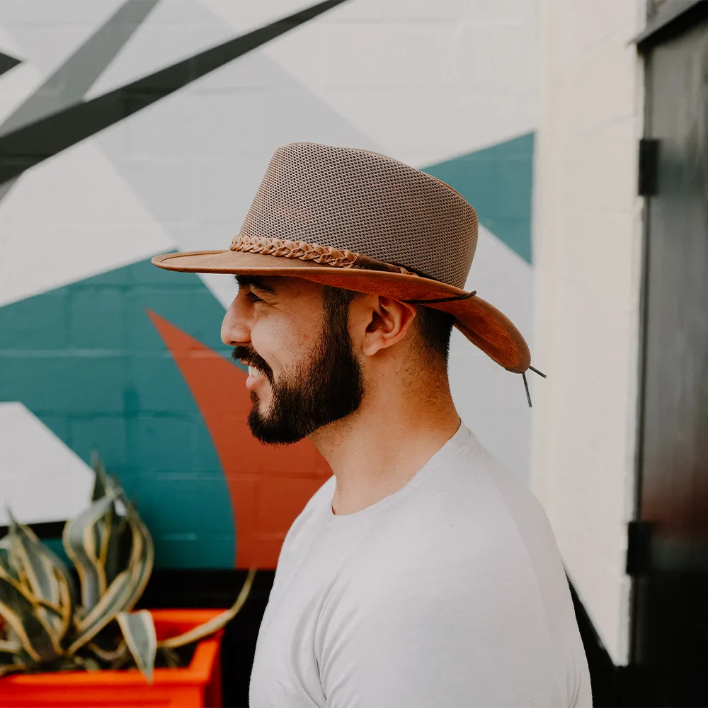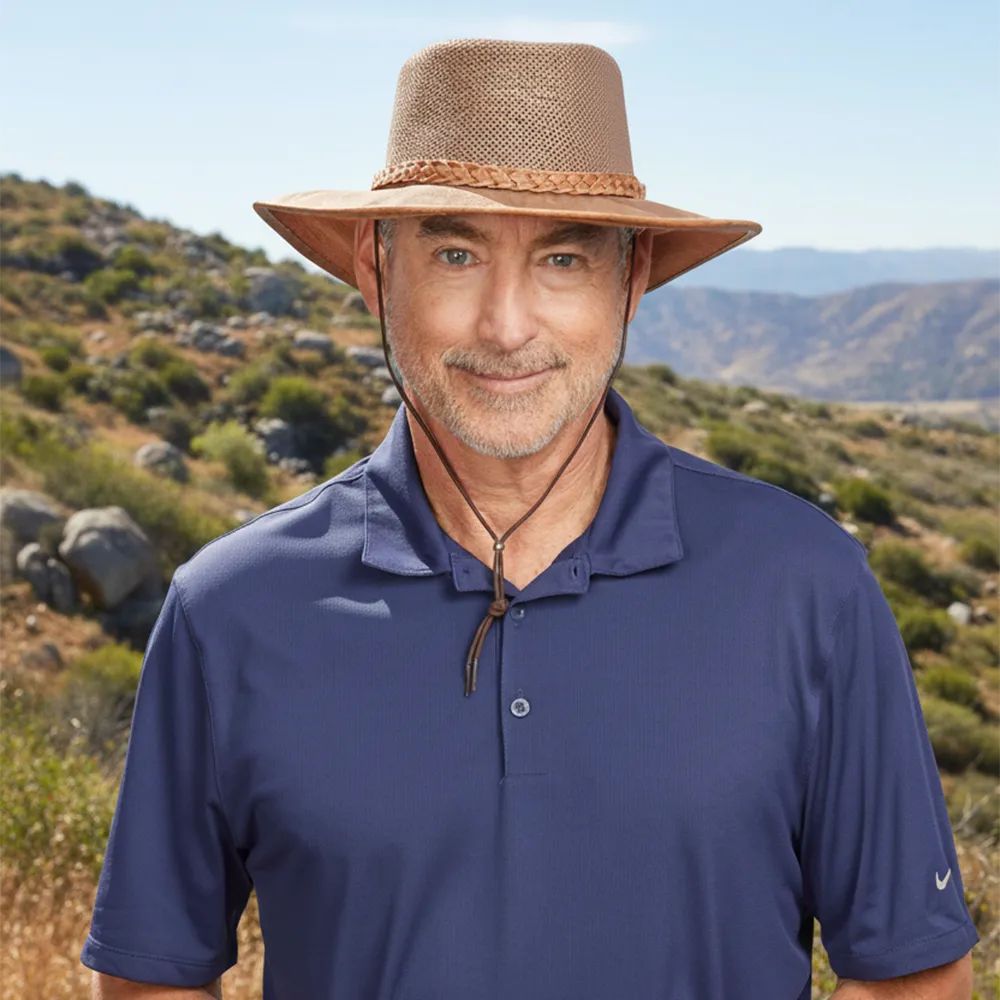 Breeze | Mens Wide Brim Sun Hat offers ultimate sun protection and water resistance with a UPF 50 rating. Made from lightweight cowhide leather and breathable mesh, this medium-brim outback hat is perfect for men seeking comfort and durability in the sun.