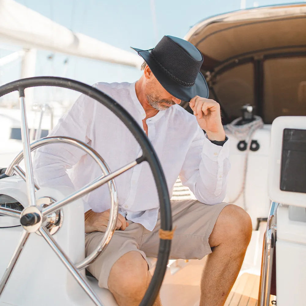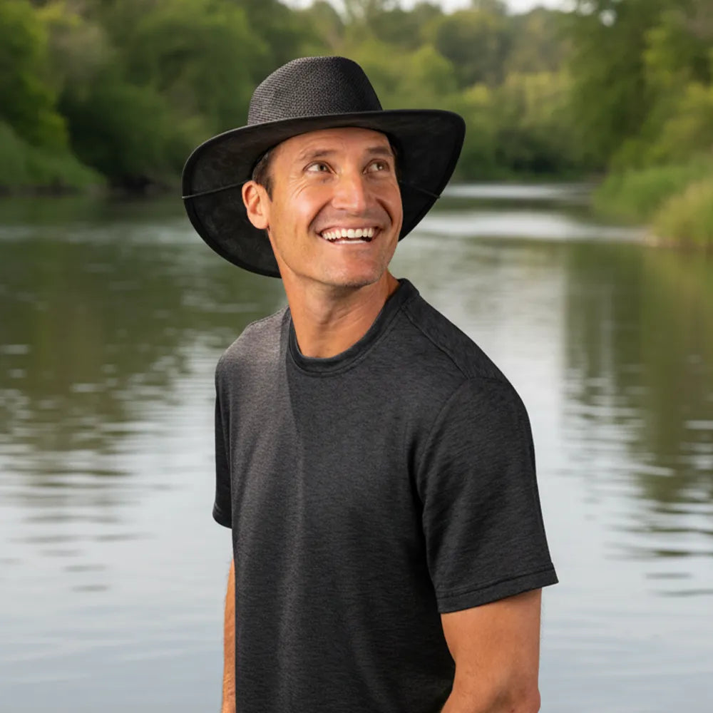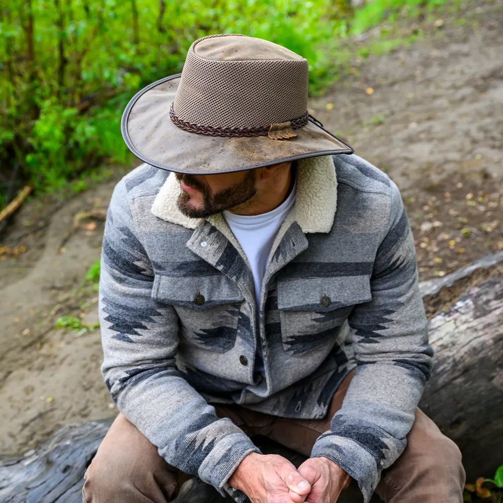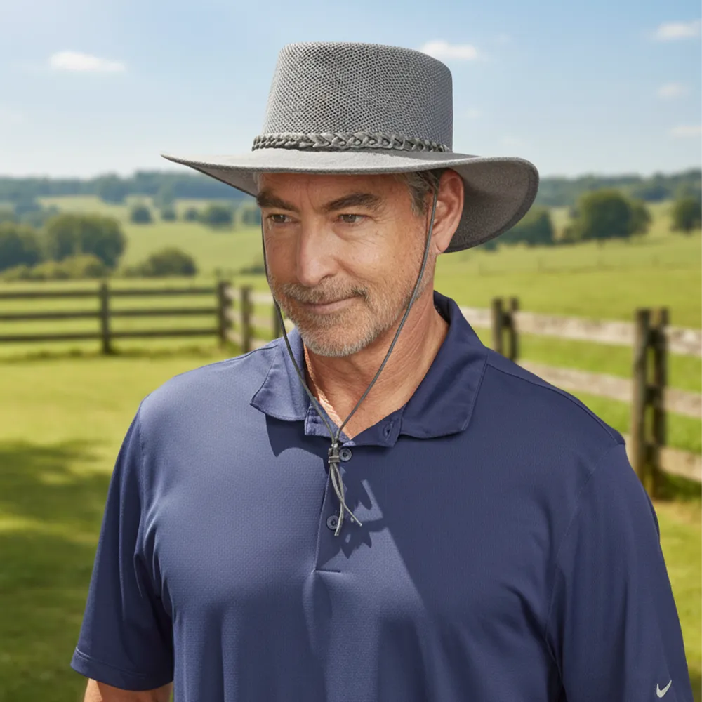 Breeze | Mens Wide Brim Sun Hat offers ultimate sun protection and water resistance with a UPF 50 rating. Made from lightweight cowhide leather and breathable mesh, this medium-brim outback hat is perfect for men seeking comfort and durability in the sun.