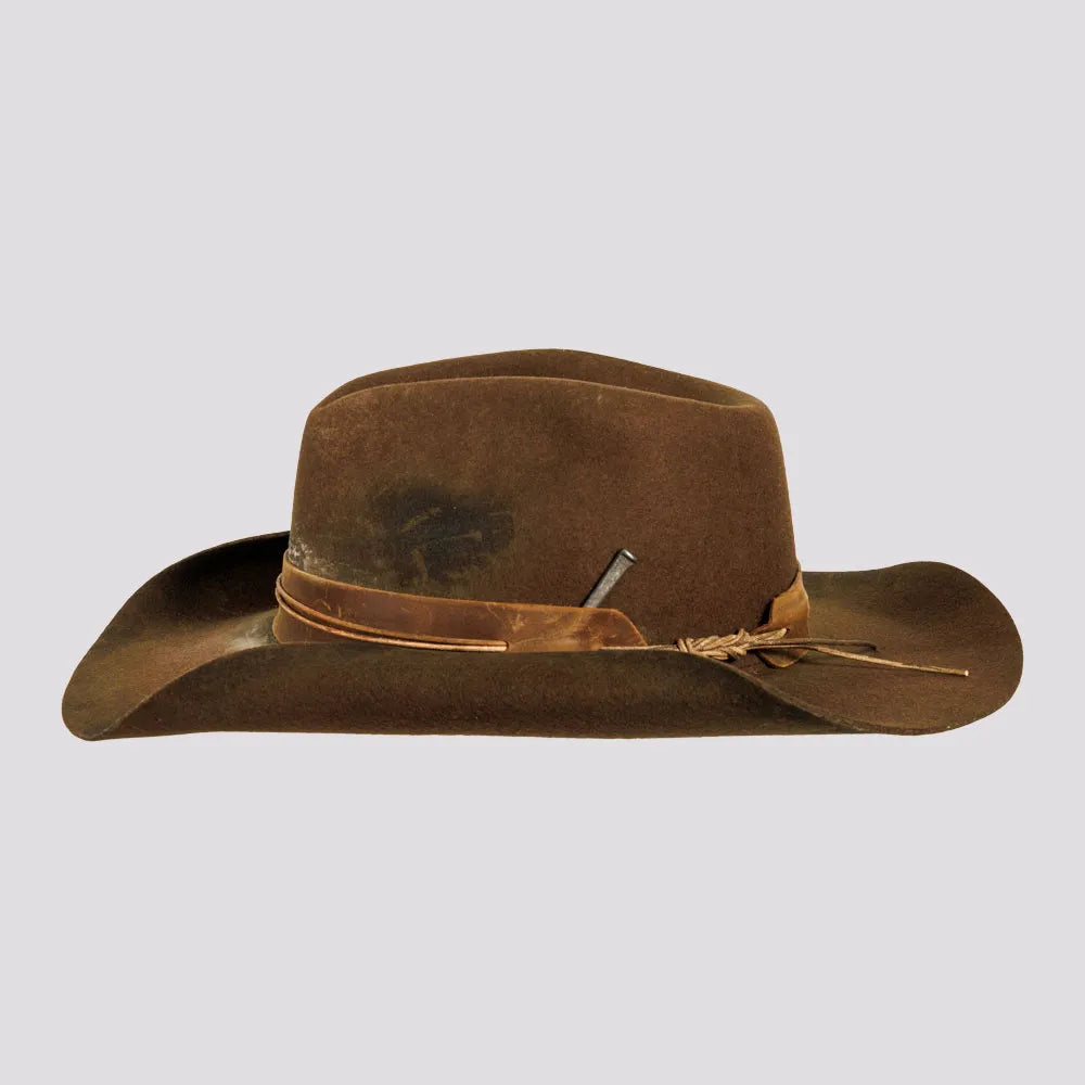 Bronson | Mens Distressed Wool Felt Cowboy Hat delivers a rugged western look with unique accents. Featuring a wide leather band, round leather lace, and antique flooring nail, this wide-brim hat is perfect for men seeking a bold and durable cowboy hat with standout details.