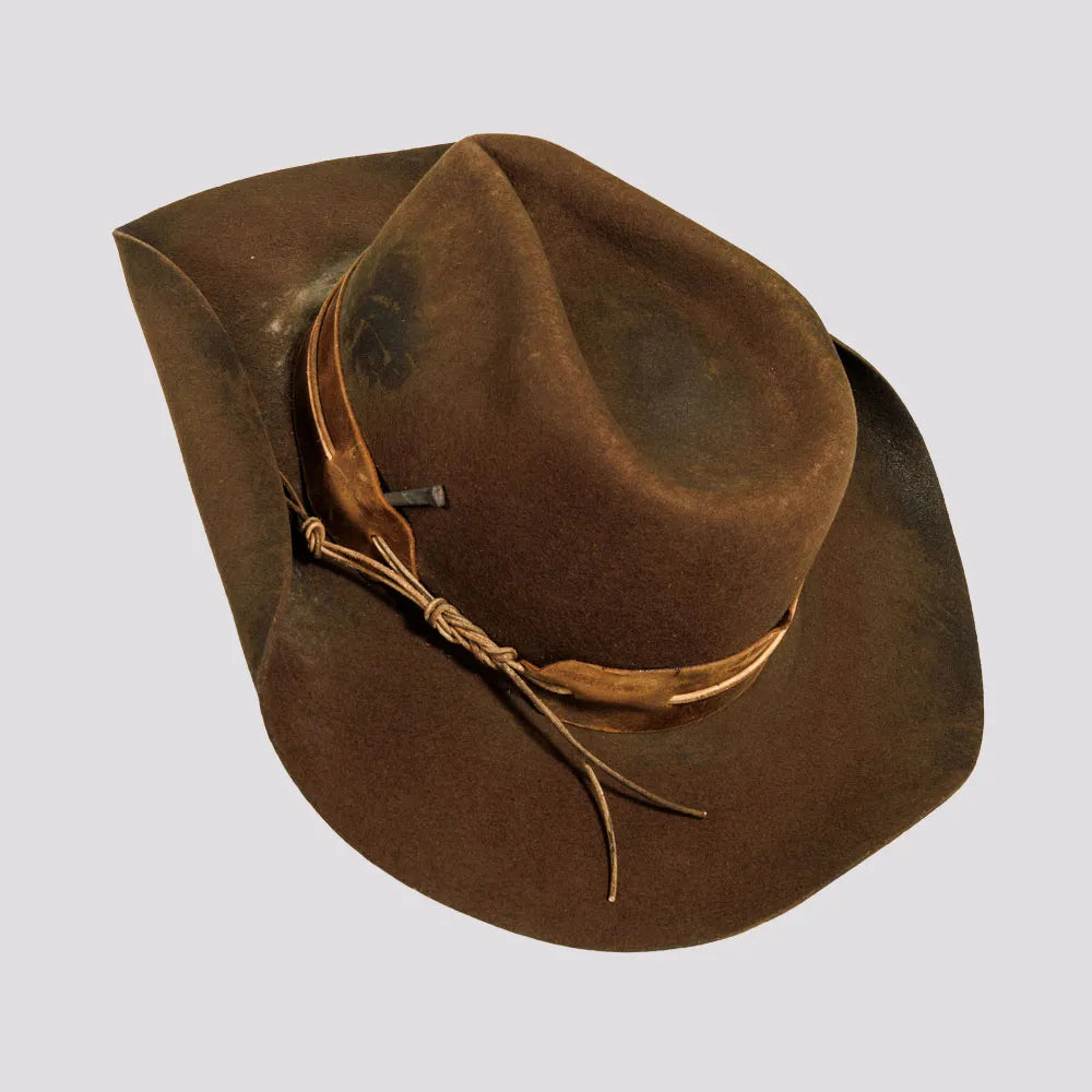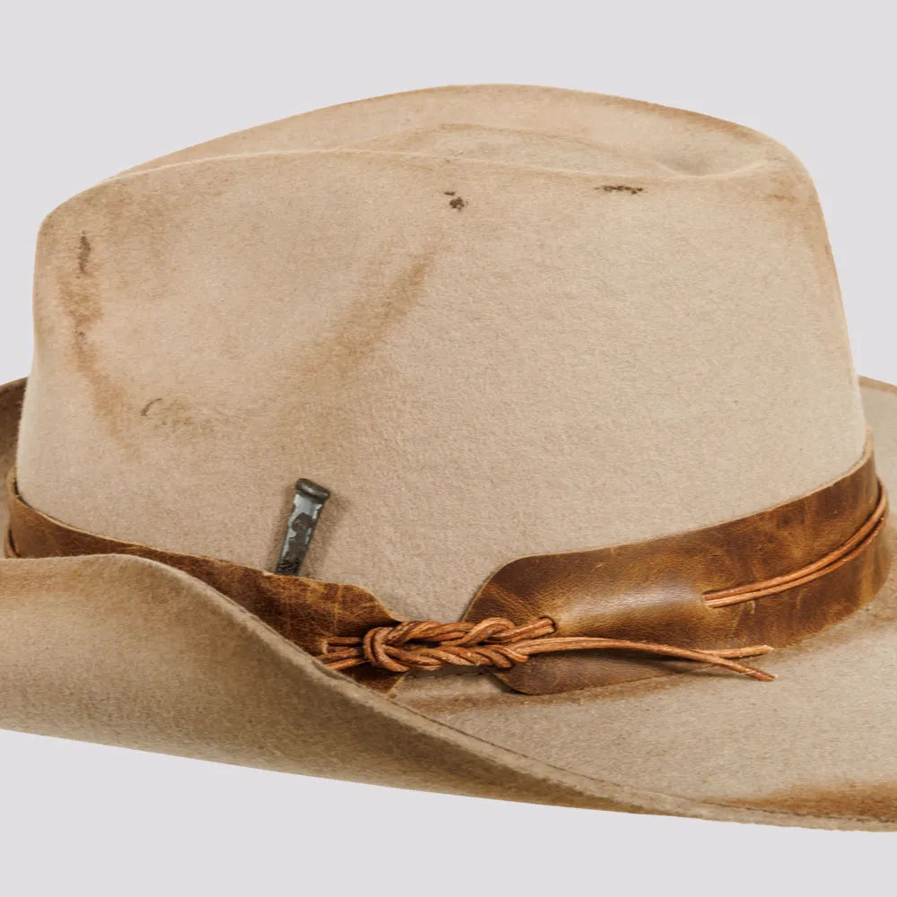 Bronson | Womens Distressed Wool Felt Cowgirl Hat offers rugged western style with unique detailing. The wide leather band, round leather lace, and antique flooring nail accent give this wide-brim hat a bold look, perfect for women seeking a durable and standout cowgirl hat.