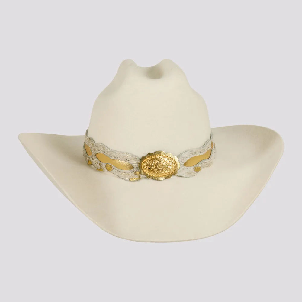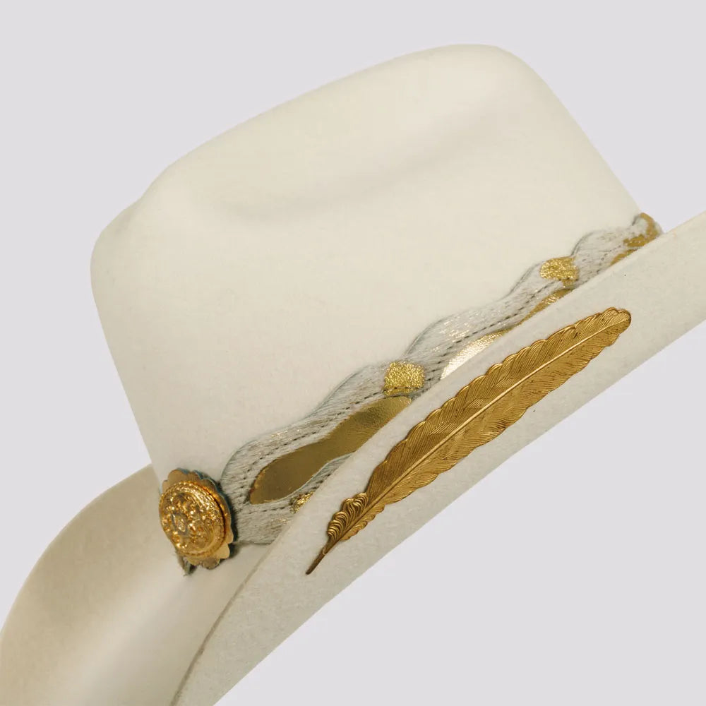 - Trim: Gold metallic feather under brim curl, front gold concho