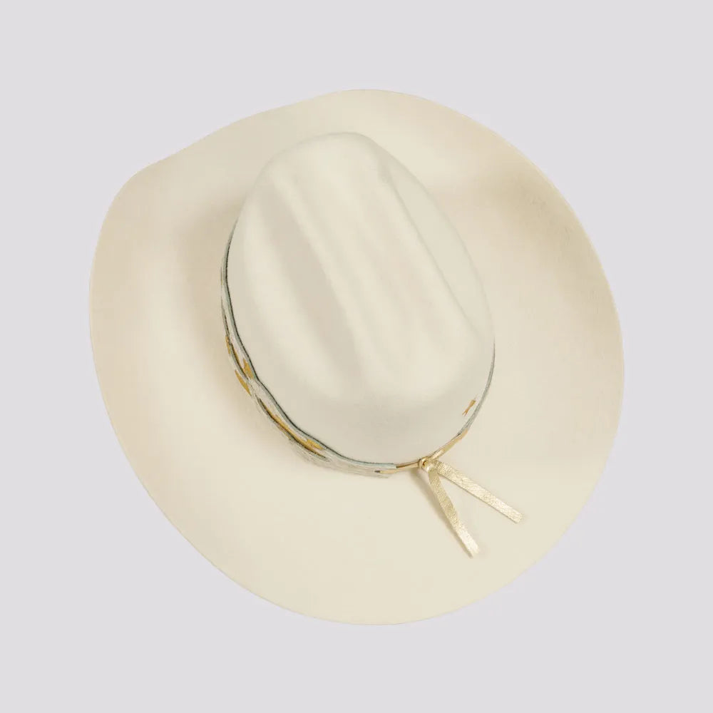 Lizzie | Womens White Felt Cattleman Cowgirl Hat offers a bold, glamorous take on classic western style. The gold metallic feather detailing and front gold concho add a touch of elegance to this wide-brim hat, making it perfect for women who want to stand out with a chic cowgirl look.